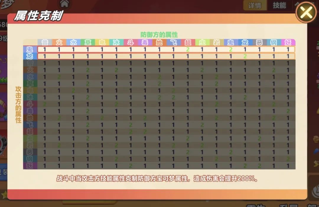 左侧为当前宝可梦的属性,使用对应类型的技能进攻上方属性的宝可梦时,如果数值是2,则会造成2倍伤害。