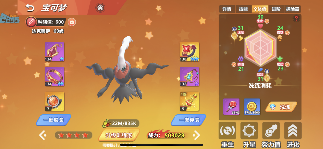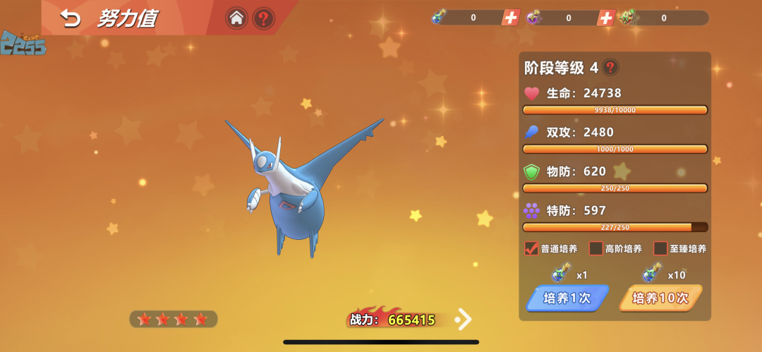 努力值可以提升宝可梦的生命、双攻、物防、特防属性,3种培养方式对应3种道具,其中普通培养可能减少属性,高阶和至尊培养都是只增加属性。