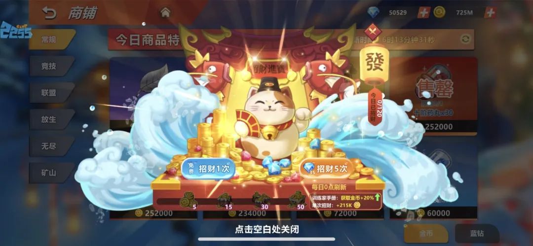 点击金币旁边的加号,招财猫每天刷起来!用金币把饰品等级拉满!